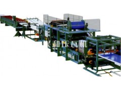 該生產線采用先進的生產工藝以氣、電、機械為一體,是加工彩鋼保溫復合板的專用機械設備,工作速度采用變頻無級調速,能一次性復合成瓦楞型復合板,全套流水線由放料機構、壓型機構、復合機構(壓筋、涂膠、加溫、復合、卷邊、開槽、整邊、氣動、自動切割)組成,是生產工業廠房、倉庫等屋面板和墻面板不可缺少的設備