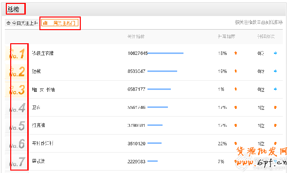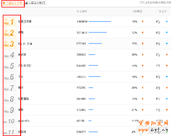透過(guò)總榜的數(shù)據(jù)我們知道,淘寶搜索框下的關(guān)鍵詞是從這些詞中篩選出來(lái)的,有可能大家看到的不是完全一樣,那是因?yàn)樘詫氝^(guò)濾了同個(gè)子類目的一些重復(fù)關(guān)鍵詞和搜索的每天變化。好,我們剛剛是看一周的關(guān)注熱門,我們要想預(yù)知下周的一些變化,就要關(guān)注每天的上升指數(shù),Ok,我們點(diǎn)擊看下: