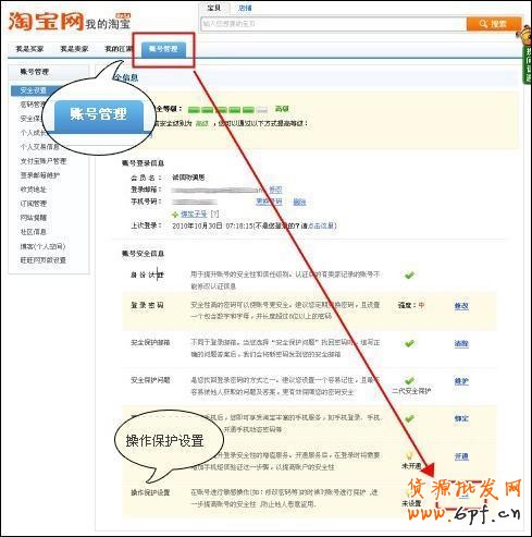 1、登錄“我的淘寶”—“賬號(hào)管理”,拉到頁(yè)面最下面的“操作保護(hù)設(shè)置”,點(diǎn)擊“設(shè)置”按鈕:
