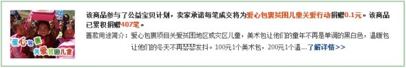 賣家在上架寶貝時自愿參與公益寶貝計劃并設置一定的捐贈比例,在寶貝成交后,會捐贈一定數目的金額給指定的公益項目,用于相關公益事業。買家在搜索寶貝時,可以選擇“公益寶貝”選項進行選購。