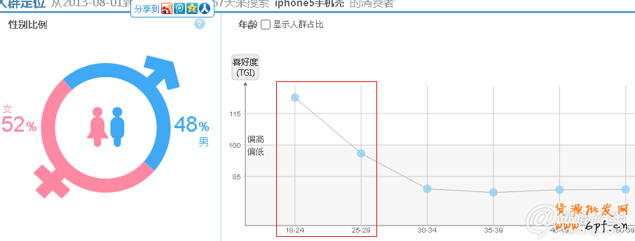 從圖片可以看出,男女比例相當(dāng),年齡在29歲以下,基于此,產(chǎn)品必須得“潮”,比較年輕化,可以是女性專用,也可以是男女通用,或是男性專用,當(dāng)然這里只是舉個列子,如果是男裝/女裝那分析年齡層次就行了。