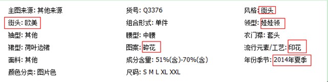 寶貝屬性如下,標題中提取了關鍵詞有碎花、女連衣裙、2014夏、娃娃領、印花裙。說白了就是中心詞、修飾詞一起修飾合并成一句話。