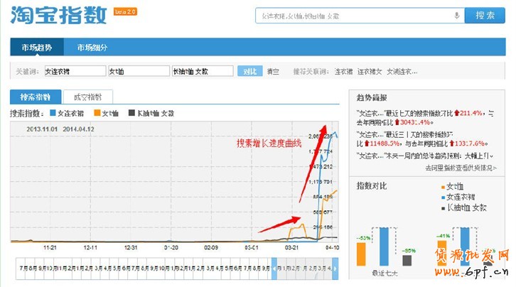看看增長曲線圖對比,這是最近4月份最新截圖數據。女裝賣家們可參考,如果你現在賣的女裝當中有剛說到幾點關鍵字,那么,你可以馬上選款后優化好寶貝標題,以及添加進直通車關鍵字。初期,推廣成本比較低,推廣費用相對低一些。