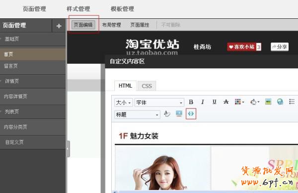 2、回到“頁面編輯”,找到“自定義模塊”,點擊“編輯”按鈕編輯。在編輯按鈕中,切換到源碼界面,將自己寫的自定義網(wǎng)頁代碼粘貼到源碼框中,并保存。若你還有CSS式樣,可以點擊“CSS”按鈕,把你的CSS式樣放進框中,如下: