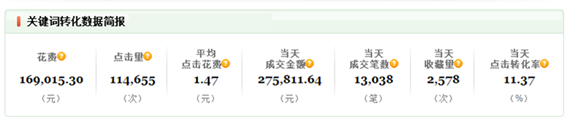 上圖是掌柜在11年做直通車的一個數據,下面是在14年5月份一整個月做直通車的一個數據圖。單純從點擊話費就可以看出來是在成倍增長。另外一個男裝的數據就更明顯了,在雙11當天的一個數據圖: