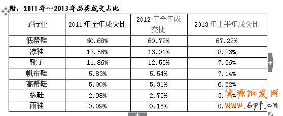 以男鞋為例,2013年上半年成交額達到62.7億元,較去年同比增長88.9%。