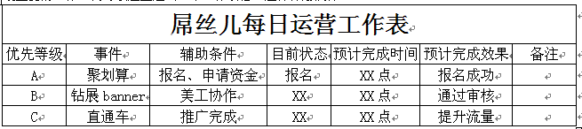 舉個例子來說,比如我今天的工作是做鉆展圖片丶直通車推廣丶報名聚劃算活動,這三項是最重要的工作。我可以建立這么一個工作表格,進行計劃執行。