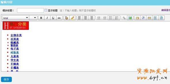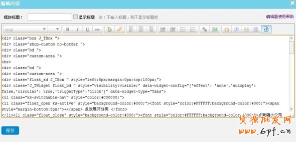 進入編輯頁面把設計好的相應代碼放入編輯框內,點擊保存即可。下圖是【編輯內容】對話框里菜單欄上的各功能分布