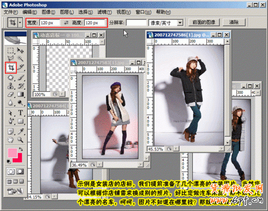 2.用PS剪裁工具,我們將第一步所準備的圖片都剪裁成120*120像素。