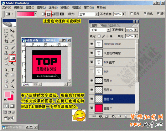 11.使用漸變工具徑向模式,注意拾色器調整出粉紅色前景色和桃紅色背景色,制作出發光效果的圖層10,所有準備工作做好了點擊切換到ImageReady。