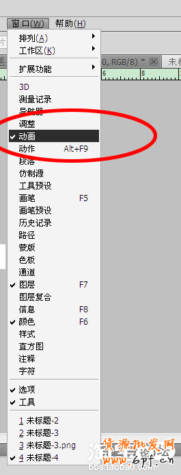 好了,下面我們就來看下具體的步驟吧,這里我們要用到imageready,一般新版的PS都是自帶這個功能的,不需要另外下載這個軟件了。我們先在PS中調出imageready這個功能,這個功能在哪里呢?我們只要點擊菜單欄中的窗口→動畫即可,使動畫在勾選狀態。
