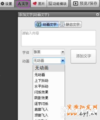 ⑴文字功能中有動畫和靜態兩種形式,動態的文字在顯示的時候可以根據你的選擇產生相應的動態效果,靜態文字顧名思義不動的文字,這兩種文字形式都可以選擇字體模式以及其他的大小設置,大家可以根據自己的需要在店標設置。下面的效果圖: