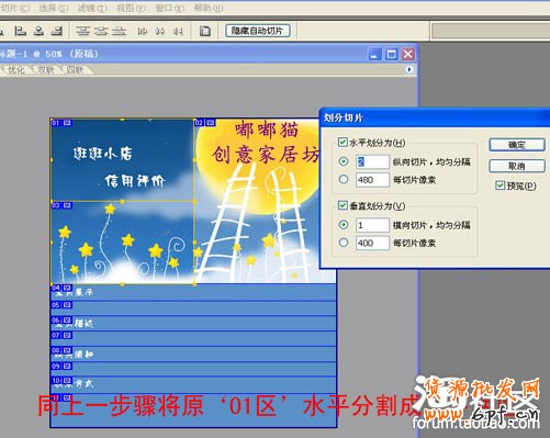 第二,切片是有講究的,凡是需要放入圖片文字的地方都必須單獨(dú)切為一片,這里我選擇水平劃分為9片;