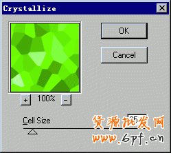 4.單擊“Filter/Pixels/Crystallize”慮鏡,在對話框中設置如下,對圖象進行晶體化處理,單擊“ok”按鈕。