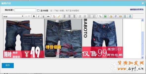 然后先保存,之后再次打開裝修寶貝詳情頁,編輯之前保存好的自定義模塊,在點開編輯窗口的右邊,有一個“編輯HTML源碼”命令按鈕,點擊,然后把之前保存在TXT文檔中的代碼復(fù)制進去,