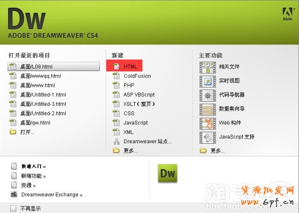 一.打開軟件 首先打開Adobe Dreamweaver CS4軟件,在初始頁面中可以從“文件”中新建,也可以直接點擊“HTML"