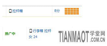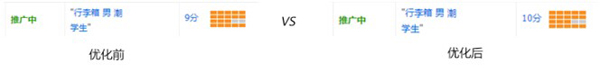 上面2個圖方格子都是滿格,但關鍵詞“拉桿箱”質量得分是8分,“行李箱 拉桿 女 24 ”的質量得分是10分,這也是因為兩個詞的競爭度不同導致的。一般情況下,大的類目詞競爭度較大,所以質量分會難以優(yōu)化到10分。而中長尾詞因為購買推廣的商家相對較少,所以質量分較高且容易優(yōu)化到10分。
