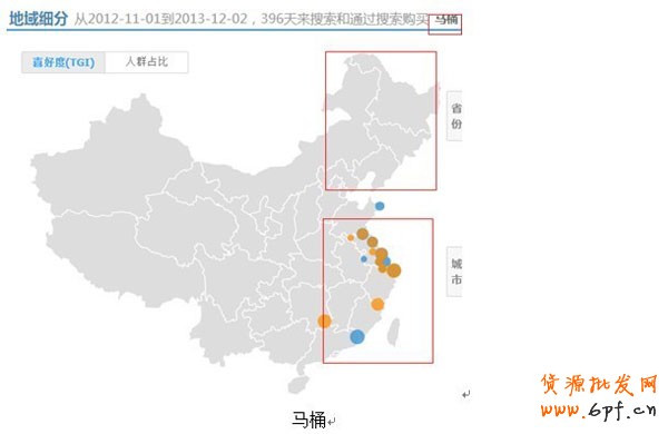 所以投直通車的時候,我們一定要做好數據分析,不然你有錢排在上面都沒人去點,我們一定要根據自己所在的類目去做好數據分析,去尋找我們的目標客戶群體到底在哪些地方。再給大家舉個例子,“座便器”和“馬桶”是同樣的東西是吧,但是南北語言的差異,不同的地方叫法也是不一樣的。所以在投直通車的時候,我們根據自己產品的叫法特點,也需要做去做地域分析,不同的地域關鍵詞的投放策略也是不一樣的。如圖: