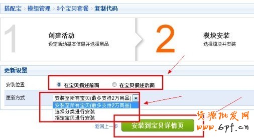 7、選擇安裝位置,以及更新方式,點擊【安裝到寶貝詳情頁】