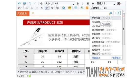 3、通用的模塊信息(比如尺碼、購物須知、店內導購等)可以存儲在模塊池中,在編輯其它寶貝時直接插入即可調用