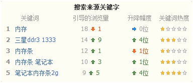 從賣家診斷助手中的數(shù)據(jù)可以看到,該店鋪中引導(dǎo)流量量最大的關(guān)鍵詞是“內(nèi)存”,但這個關(guān)鍵詞并不是整個淘寶搜索中最熱門的關(guān)鍵詞。而“筆記本內(nèi)存條2g”這個關(guān)鍵詞,在淘寶搜索中更加熱門,如果能夠優(yōu)化這個關(guān)鍵詞下的寶貝在搜索的排名,那可以獲得更多的流量。另外,寶貝中產(chǎn)品詞堆砌的情況非常嚴(yán)重,例如,有個寶貝標(biāo)題為:“金士頓 內(nèi)存 DDR3 1333 4G 筆記本 內(nèi)存條 三代4g 筆記本內(nèi)存條”,筆記本內(nèi)存條這幾個字出現(xiàn)了兩遍,標(biāo)題不要為了填滿30個字而來填寫,要簡單易讀。