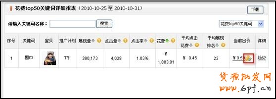 • (2) Top50關鍵詞詳細報表 “Top50關鍵詞詳細報表”為用戶提供不同數據指標排行TOP50的關鍵詞詳細數據,用戶可以選擇查看點擊量top50關鍵詞、展現量top50關鍵詞、點擊量為0關鍵詞等數據,可以輸入關鍵詞名進行相應關鍵詞的數據查詢。還可以選擇“下載”詳細報表。