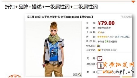 “韓版”風格,這個產品的風格屬性也定下了?!靶蓍e小西裝領短外套”,這組詞匯我之所以放在一起,既可以拆分成“休閑小西裝”“短外套”也可以拆分成“休閑 西裝”“短外套”也就是說,這個短語也覆蓋了很多的搜索信息。最后一組數字“W33030”是這個商品的貨號。其中覆蓋了現在的季節當中以下熱搜詞匯“購物新風尚”“韓版”“女裝”“2013”“西裝”“外套”等等熱搜詞匯。在這里,其實除了熱搜之外,商品的基本屬性表達的也很明確。這是大牌的做法,小賣家可以借鑒,但考慮到小賣家資金實力不夠,所以在設置商品屬性詞時,可以從小處著手,不像他們那么覆蓋廣,力求覆蓋精。