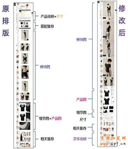 差異:圖片、文字排列整齊,不同類別信息分開呈現,模特圖精簡放大,產品圖配以可視化圖標,增加試穿尺碼。