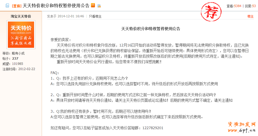 本文來源: 淘寶公告:天天特價暫停使用積分和特權(quán)