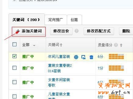 如果您想針對目前推廣中的寶貝添加關鍵詞,點擊“管理推廣中的寶貝”—“編輯”,在關鍵詞管理頁面右上角有“添加關鍵詞”按鈕,之后進入添加關鍵詞頁面。