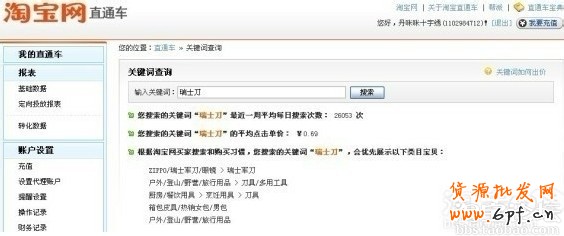 下面用到:淘寶直通車關鍵詞查詢功能。我們這里以上面選中的“瑞士刀”為例。