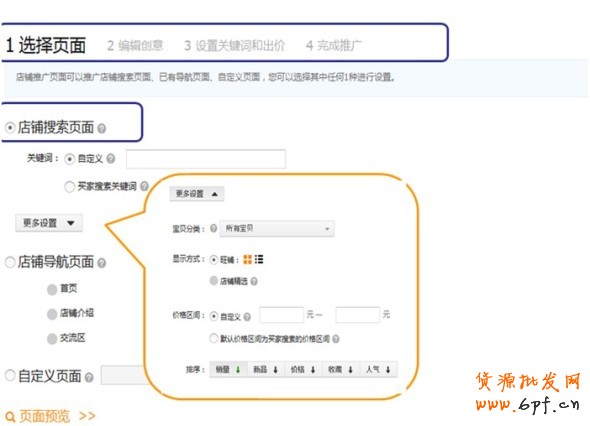 店鋪推廣有3種頁面設置選擇,店鋪搜索頁面、店鋪導航頁面和自定義頁面,你可以選擇其中任一種。新版對店鋪推廣在選擇頁面上進行了優化,搜索頁面“更多設置”屬于高級功能,更智能靈活的頁面寶貝展示。