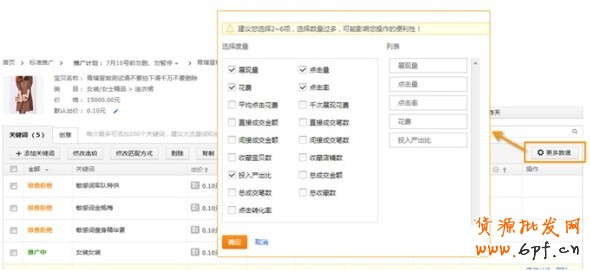 2)更多數據和恢復默認:點擊右上角“更多數據”按鈕,您可以自主選擇在推廣計劃管理區內顯示的數據度量。系統提供18個數據字段選擇,系統默認給展現量、點擊量、點擊率和花費?;謴湍J便于快速回到系統提供的4個字段。