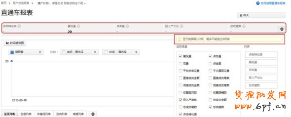 在頂部重要數據指標區,點擊右側的小按鈕,您可以選擇表頭的數據指標,新版后臺您可從最多顯示五項指標增至九項,讓您第一時間一目了然每日關注的重要指標。