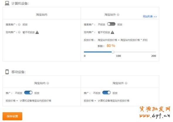 拖動滾動條可以通過改變折扣的數值控制當前推廣計劃在計算機設備淘寶站外投放時的投放價格點開網站列表將展開部分與直通車合作的外部網站列表。