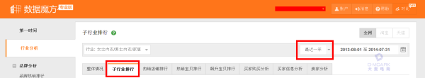 任何一間店鋪都要必須配合外部大環境的趨勢發展而順勢而為才能大展拳腳,如果不能適從,那么店鋪經營就會遇到銷售瓶頸。因此,店主想要找到屬于店鋪的熱銷款,首先要從客觀的數據了解行業發展和趨勢。數據魔方的行業分析中,可以查看各個子行業銷售排行在最近一年,三個月,30天,7天的的數據變化,總結出過去一年,三個月,30天,7天的行業大環境發展,并評估未來的趨勢。首先,我們打開數據魔方,在行業分析中,打開子行業排行,并選取最近一年為時間維度,查看最近一年整體銷售數據。