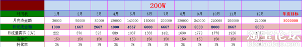 例如,我們規(guī)劃今年要做兩百萬的銷售額,那么我們就需要將這兩百萬給分解,根據(jù)產(chǎn)品的淡旺季分布到每個(gè)月當(dāng)中去,然后再來把每個(gè)月的銷售額又來拆分,根據(jù)我們的常用公式:銷售額=流量*轉(zhuǎn)化率*客單價(jià),得出:流量=銷售額/(轉(zhuǎn)化率*客單價(jià)),那么,我們就可以算出要做到這么多銷售額需要多少流量,然后我們再來分配需要利用哪些資源才能夠得到那么多的流量,如圖:
