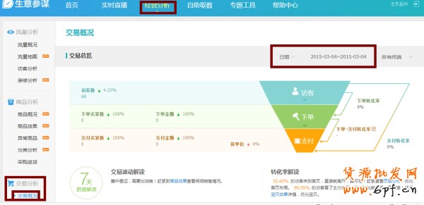 實時直播這個模塊我主要關(guān)注的是訪客的一個時間段還有入店來源入店關(guān)鍵詞等,能更好更及時的發(fā)現(xiàn)來訪客戶的一個特點。是無線端數(shù)據(jù)增長多些還是PC端數(shù)據(jù)增長多些,付費的來源多些還是免費的流量多些等等,現(xiàn)在是無線時代,個人重點關(guān)注的是無線數(shù)據(jù)這塊,還有就是免費流量這塊,大家都知道如果一個店鋪的流量付費的流量比免費的多很多的話那這個店鋪肯定有很大的問題。