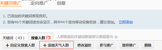 2、然后進(jìn)入直通車后臺(tái),對應(yīng)的寶貝關(guān)鍵詞頁面,選擇搜索人群推廣,添加天氣人群。