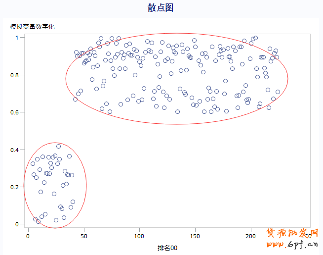這個就是我剛剛弄好的兩個變量,其中假設(shè)排名分,就是設(shè)的一個根據(jù)排名越高,給分越高的一個設(shè)定,在這個分析中,并沒有什么作用,大家不必去在意。然后,需要做一個初步判斷,最簡單的方法,就是作圖,直觀,簡單,能看出很多東西。我先做了一個散點圖,看看分布。