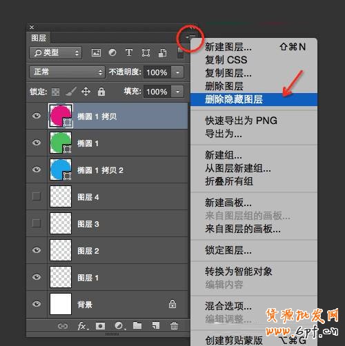 而刪除的方法也很簡單,只是平時少用到這個功能,所以沒留意到罷了。我們只需將鼠標放到圖層面板上,點擊面板右上角的展開菜單命令,點擊“刪除隱藏圖層”,那么,這時候的所有隱藏圖層都會被刪掉。