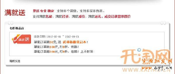 限時(shí)打折(不限時(shí)長(zhǎng),支持7折以下),團(tuán)購(gòu)(精美模版),滿(mǎn)就送,搭配套餐,包郵;自動(dòng)上下架,自動(dòng)櫥窗;買(mǎi)家分享自動(dòng)給優(yōu)惠;微博推廣,郵件推廣;支持在店內(nèi)開(kāi)展試用活動(dòng);提高流量,客單價(jià),客戶(hù)粘度;美化店鋪等等,功能很強(qiáng)大,而且是免費(fèi)的。
