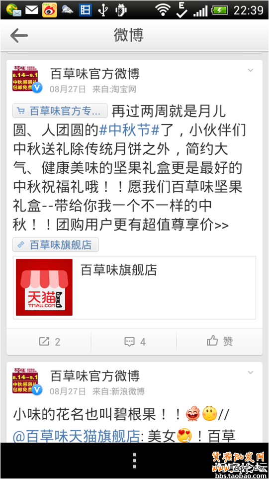 百草味在淘寶網開的集市專營店在旺鋪后臺開通微博淘寶版后,帶來了幾項明顯的變化。