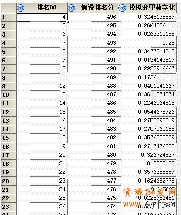 這個就是我剛剛弄好的兩個變量,其中假設排名分,就是設的一個根據排名越高,給分越高的一個設定,在這個分析中,并沒有什么作用,大家不必去在意。然 后,需要做一個初步判斷,最簡單的方法,就是作圖,直觀,簡單,能看出很多東西。我先做了一個散點圖,看看分布。