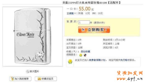 F 庫存因素:我們的庫存比較多,而銷量又比較小的時候,我們可以適當把價格壓下來,而當我們的庫存較小,而銷量又比較大的時候,我們也可以把價格抬高。當然,快遞費,時間成本,和精力成本,還有其他各種各樣的因素,都應該適當考慮到,即使他們并不是主導因素。低價策略不應該是主導策略,作為小賣家,在沒什么剩余的情況下,長期低價只會虧,所以,賣家更應該把精力更多的花在完善寶貝圖片,頁面,營銷等方面的事情來提高產(chǎn)品的價值。所以其實不必糾結于我低價就一定能賣得好這話題上?看看下面這張圖片,下面是一個賣家的ZIPPP打火機的寶貝頁面。