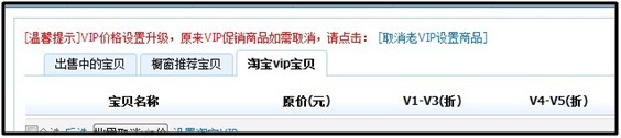 二、點擊“淘寶VIP寶貝”后,會出現如下紅字,然后點擊“取消老VIP設置商品”。