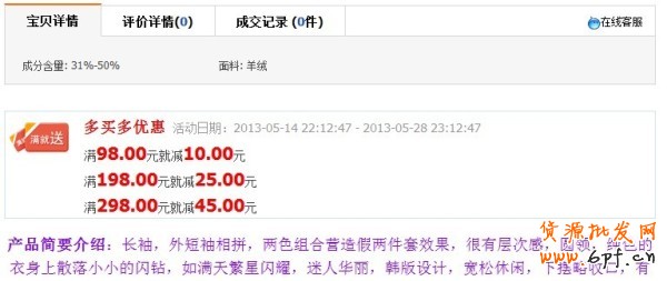 例:設置全店滿98元減10,滿198元減25元,滿298元建45元,這樣多買多優惠的促銷活動,如果買家本來只打算在你店鋪買1件138元的衣服,然后看到你這個活動滿198元減25元,就會再在你店鋪挑一件60元左右的T恤,來湊滿198元可以享受到這個活動,這樣就大大提高了店鋪的銷量。