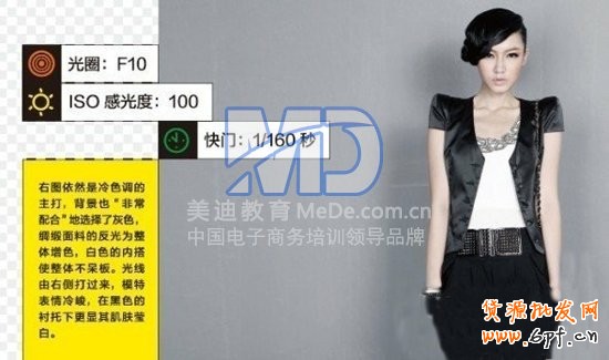 攝影師對(duì)此片運(yùn)用了主光由左側(cè)打向模特,產(chǎn)生陰影,使得模特整體感更顯苗條。攝影最講究的是光線的運(yùn)用,所以,在正式拍攝前可以拍一些“撥拉片”來(lái)對(duì)光線進(jìn)行調(diào)整。比較之下,棚拍要比一般的攝影難,難就難在對(duì)光線的控制,因?yàn)閿z影棚里拍攝快門(mén)一按,就會(huì)出現(xiàn)燈光的影閃,拍出來(lái)的照片要不太暗,要不太亮。