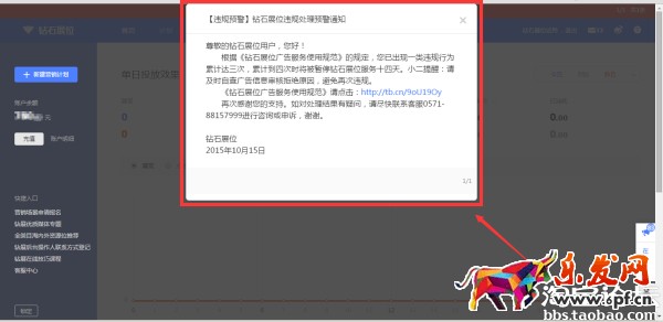 如果賬戶(hù)收到重要通知,在您登錄鉆石展位后臺(tái)時(shí)會(huì)自動(dòng)彈出在屏幕中央,關(guān)閉后才能進(jìn)行其它操作。關(guān)閉后不會(huì)再次彈出,可進(jìn)入消息中心查看歷史消息。