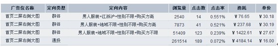 通過和商家的溝通,了解到商家對該廣告位行業(yè)的流量價值不太了解,一心想用高的出價獲取高的排名從而能夠買到更多流量來配合推自己店鋪的周年慶活動。這樣就造成了整體廣告計劃的出價太高,無論是底價和定向都遠遠高于行業(yè)的平均值。以下附上該廣告位行業(yè)數(shù)據(jù)參考: